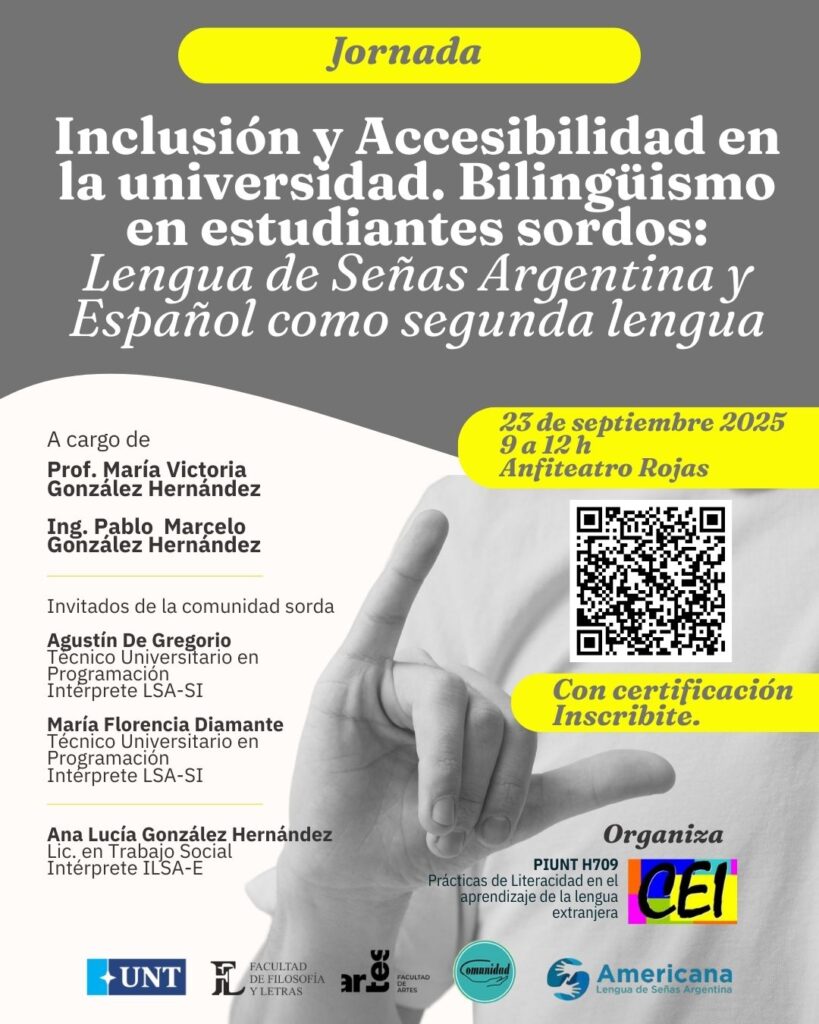 El próximo martes 23 de septiembre, de 9 a 12 horas, en el Anfiteatro Rojas de la Facultad de Filosofía y Letras (Av. Benjamín Aráoz 800) se llevará a cabo la jornada “Bilingüismo en estudiantes sordos: Lengua de Señas Argentina y Español como segunda lengua”. Se trata de un encuentro que busca abrir el debate en torno a la accesibilidad en la educación superior y el valor del bilingüismo como herramienta de inclusión.
