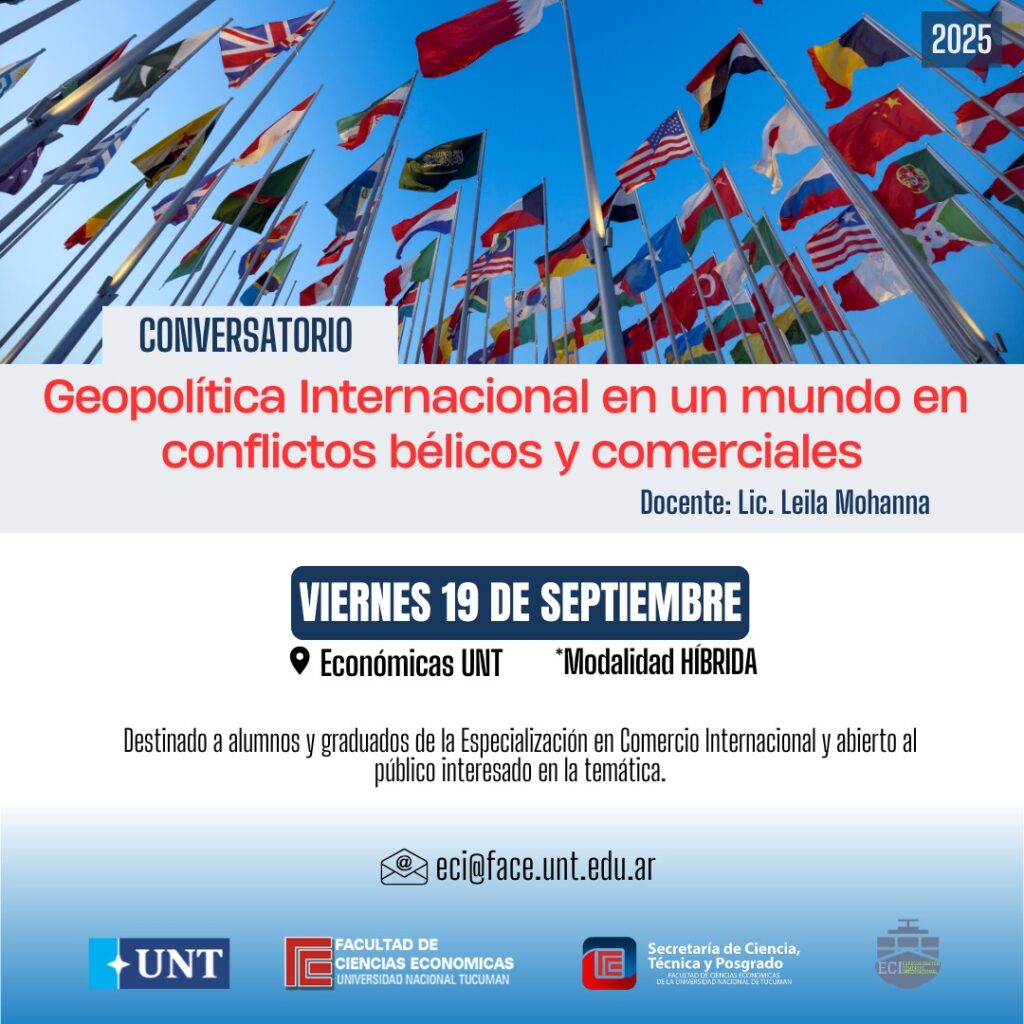 La Facultad de Ciencias Económicas de la Universidad Nacional de Tucumán (UNT) invita al conversatorio “Geopolítica Internacional en un mundo en conflictos bélicos y comerciales”, que se desarrollará el próximo viernes 19 de septiembre, de 17:00 a 20:30 horas, en modalidad híbrida.