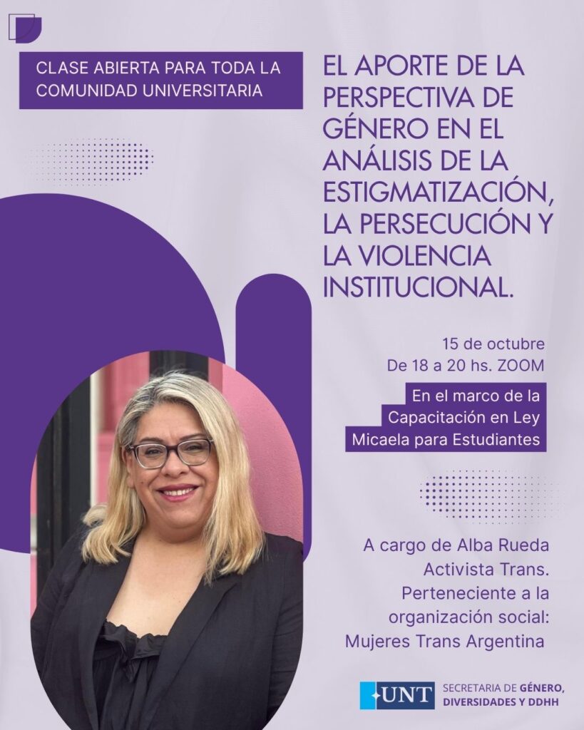 La Universidad Nacional de Tucumán invita a participar de la clase abierta titulada “El aporte de la perspectiva de género en el análisis de la estigmatización, la persecución y la violencia institucional”, en el marco de las acciones de formación impulsadas por la Ley Micaela. La instancia está dirigida especialmente a estudiantes universitarios y estará a cargo de Alba Rueda, referente nacional e internacional en políticas de diversidad.