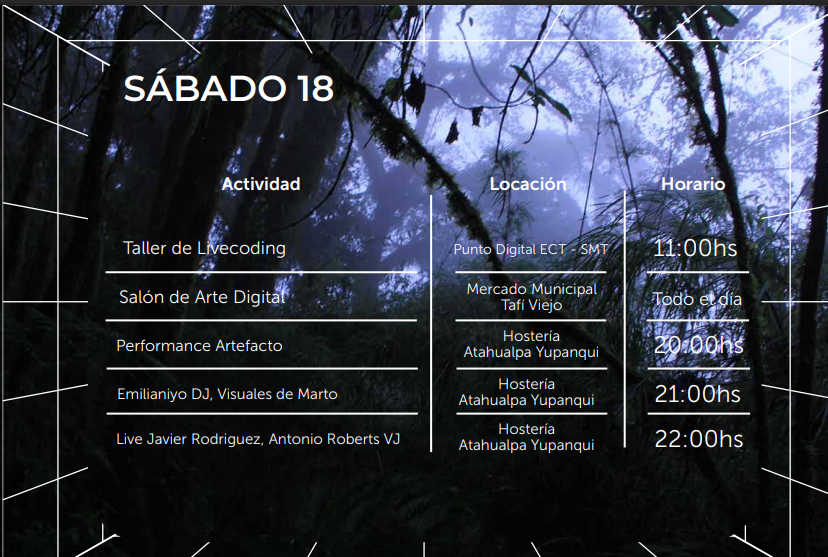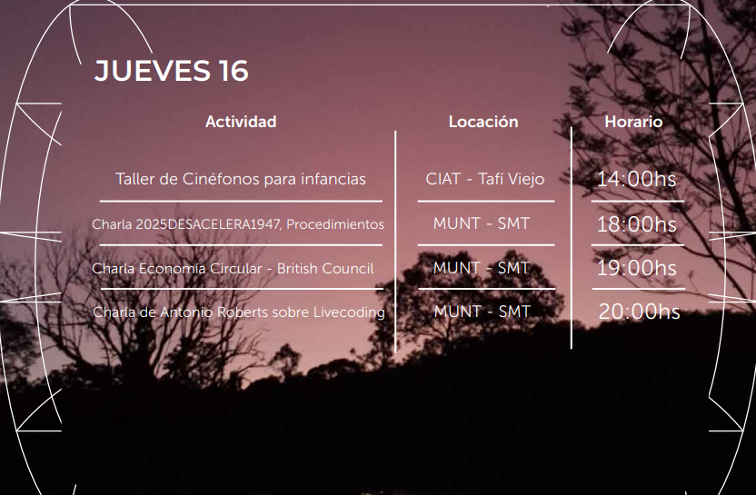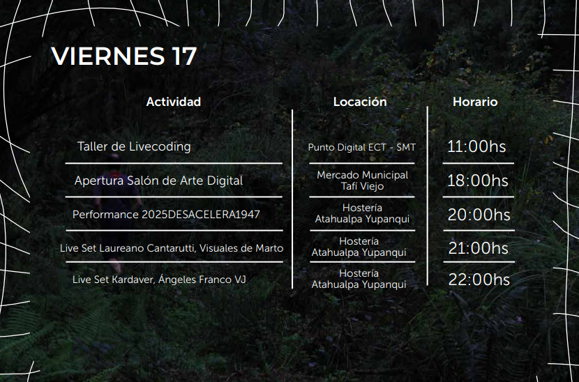El cronograma detalla actividades como un Taller de Cinéfonos para infancias y charlas sobre Livecoding y Economía Circular, además de exhibiciones y performances en locaciones como el Museo de la UNT (MUNT), el Punto Digital ECT y la Hostería Atahualpa Yupanqui en Tafi Viejo. Artistas destacados incluyen a Antonio Roberts de Inglaterra, Karen Palacio de Córdoba y talentos locales como Ángeles Franco y Emiliano Pineda.