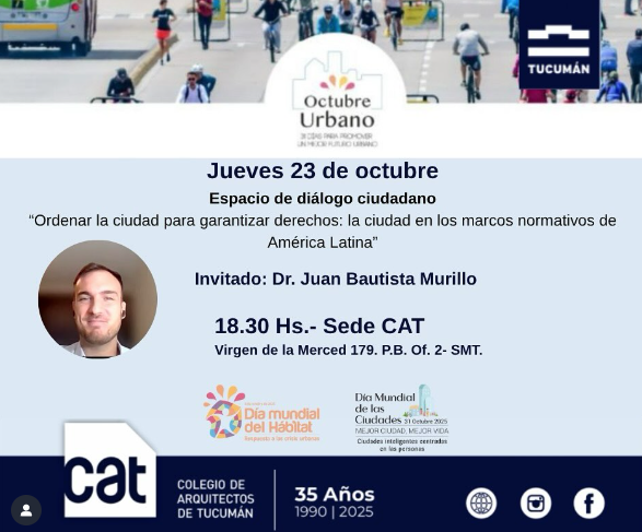 El encuentro se llevará a cabo hoy jueves 23 de octubre a las 18.30 en la sede del Colegio de Arquitectos de Tucumán (Virgen de la Merced 179, planta baja, oficina 2). La charla se titula “Ordenar la ciudad para garantizar derechos: la ciudad en los marcos normativos de América Latina” y estará a cargo del Dr. Juan Bautista Murillo, abogado, doctor en Derecho por la UNT y especialista en Desarrollo y Políticas Públicas.