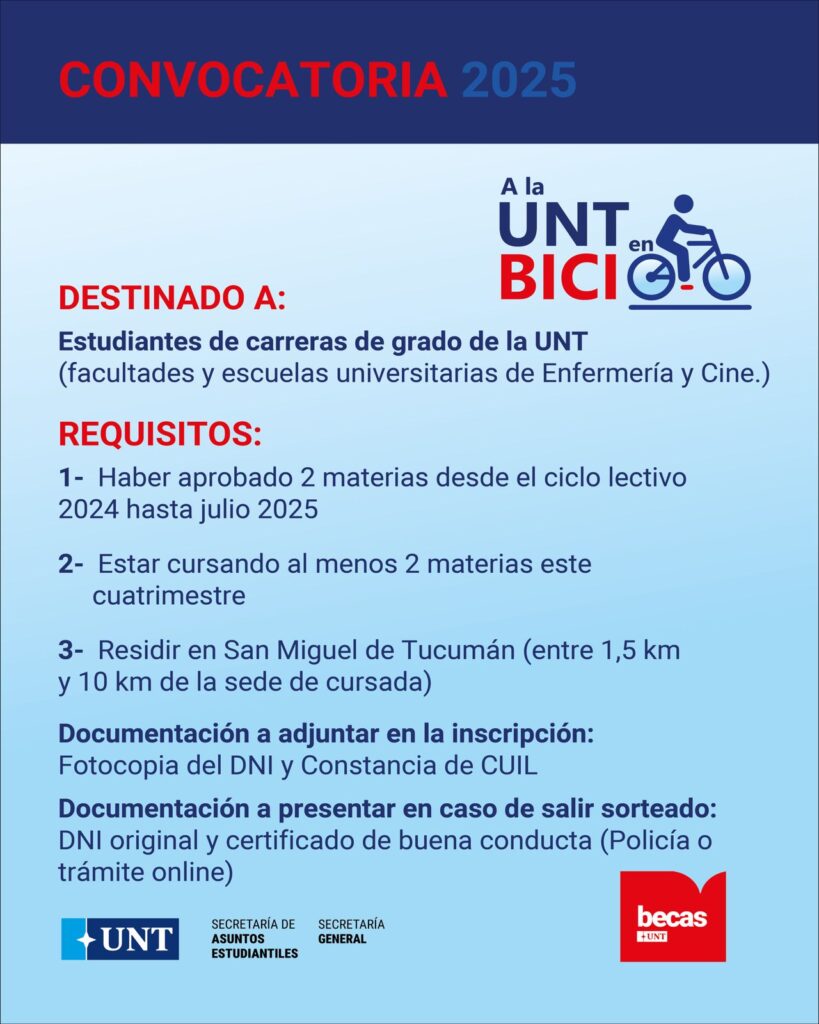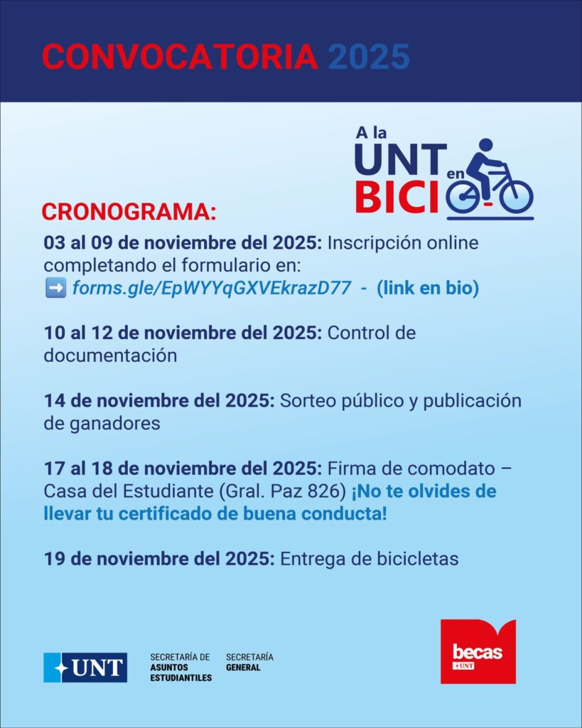 Las inscripciones estarán abiertas del 3 al 9 de noviembre de 2025, y se realizarán mediante el formulario disponible en la bio de @sae.unt. Habrá sorteo de bicicletas entre quienes cumplan los requisitos académicos y residenciales