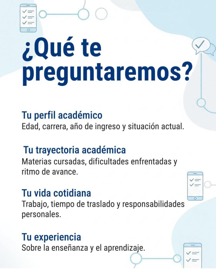 La convocatoria es amplia: cada estudiante tiene la oportunidad de visibilizar su situación académica, compartir cómo organiza su tiempo entre el estudio y el trabajo, y señalar qué factores facilitan o dificultan su avance en la carrera.