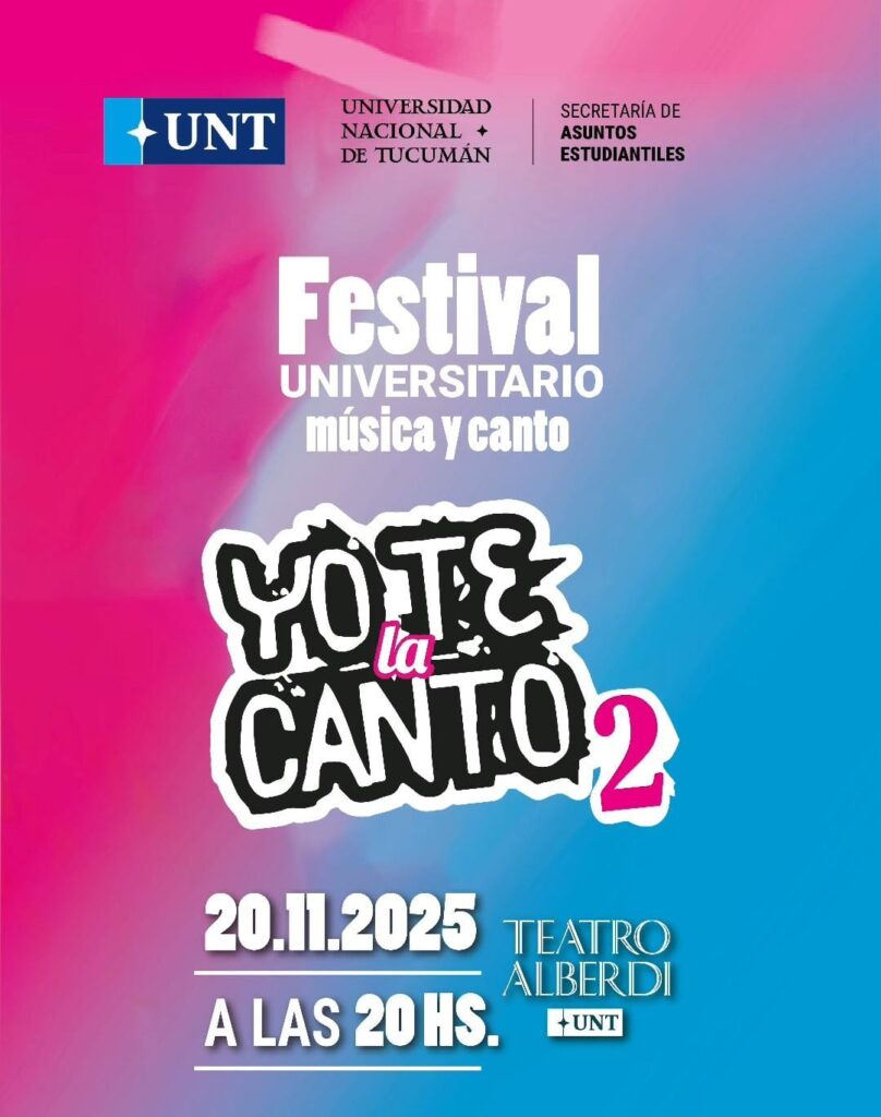 La Universidad Nacional de Tucumán (UNT), a través de la Secretaría de Asuntos Estudiantiles (SAE), anunció la realización de la segunda edición del Festival de Música y Canto “Yo te la canto”, que tendrá su gran gala final el jueves 20 de noviembre a las 20 h en el Teatro Alberdi, con entrada libre e inscripción previa.
