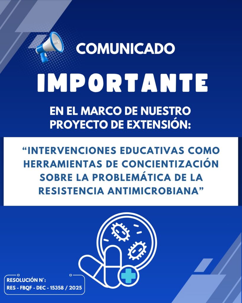 Además, desde la facultad se invita a los estudiantes a sumarse a la Práctica Social Educativa (PSE) vinculada al proyecto de extensión “Intervenciones educativas como herramientas de concientización sobre la problemática de la resistencia antimicrobiana”, aprobado bajo Resolución RES-FBQF-DEC-15358/2025.