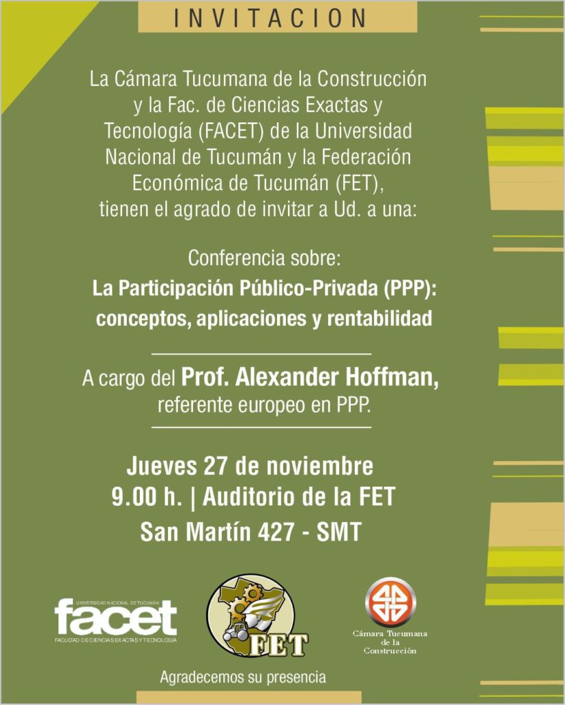 Promoviendo una mirada actual sobre los modelos de Participación Público-Privada (PPP) La Facultad de Ciencias Exactas y Tecnología (FACET) de la Universidad Nacional de Tucumán (UNT), en conjunto con la Cámara Tucumana de la Construcción y la Federación Económica de Tucumán (FET), realizará una conferencia destinada a profesionales, estudiantes, instituciones y al público interesado en los nuevos modelos de cooperación entre el Estado y el sector privado.