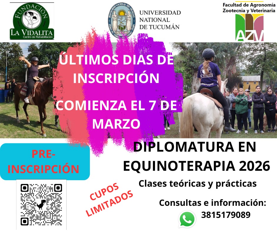 La Facultad de Agronomía, Zootecnia y Veterinaria (FAZYV) de la Universidad Nacional de Tucumán (UNT) invita a la comunidad a participar de la Diplomatura en Equinoterapia, una iniciativa que se desarrolla de manera conjunta con la Fundación La Vidalita.