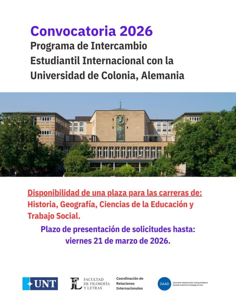 La Facultad de Filosofía y Letras de la Universidad Nacional de Tucumán (UNT) informa que está abierta la convocatoria 2026 para el Programa de Intercambio Estudiantil Internacional con la Universidad de Colonia, Alemania, destinada a estudiantes de las carreras de Historia, Geografía, Ciencias de la Educación y Trabajo Social.