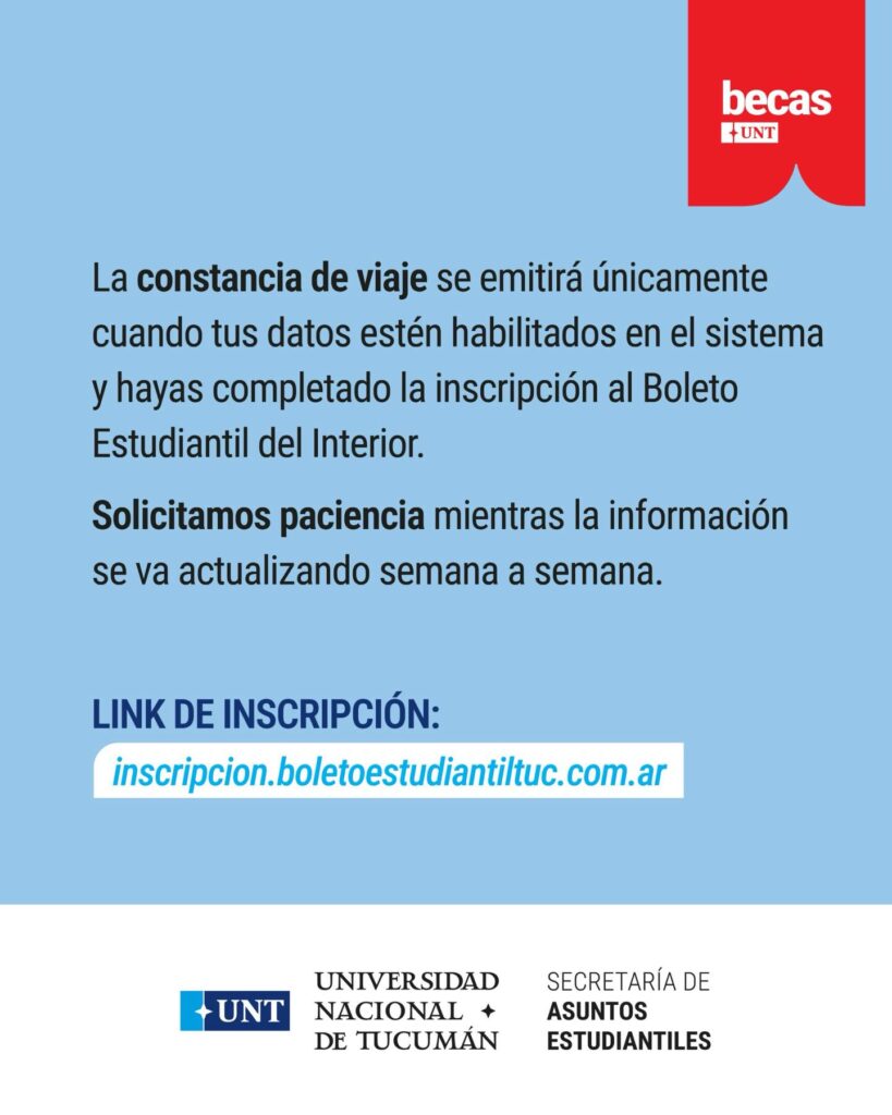 Según se detalló, podrán inscribirse quienes estén domiciliados en el interior de la provincia de Tucumán —quedando excluidos los residentes de San Miguel de Tucumán—, sean ingresantes 2026 o alumnos regulares 2025 de la UNT, y se encuentren inscriptos o reinscriptos para cursar el próximo año académico. Además, deberán residir a más de 900 metros del establecimiento educativo.