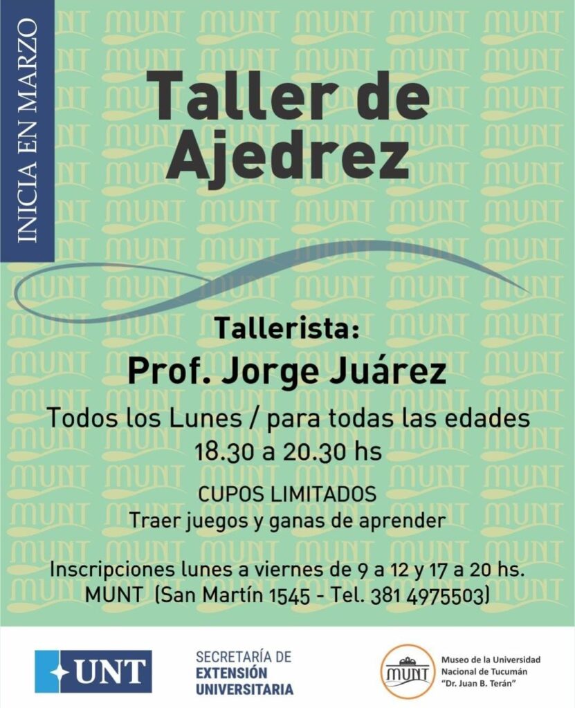 El MUNT también invita a sumarse a los Talleres de Ajedrez, coordinados por el profesor Jorge Juárez. La propuesta está destinada a niños desde los 10 años, jóvenes y adultos.