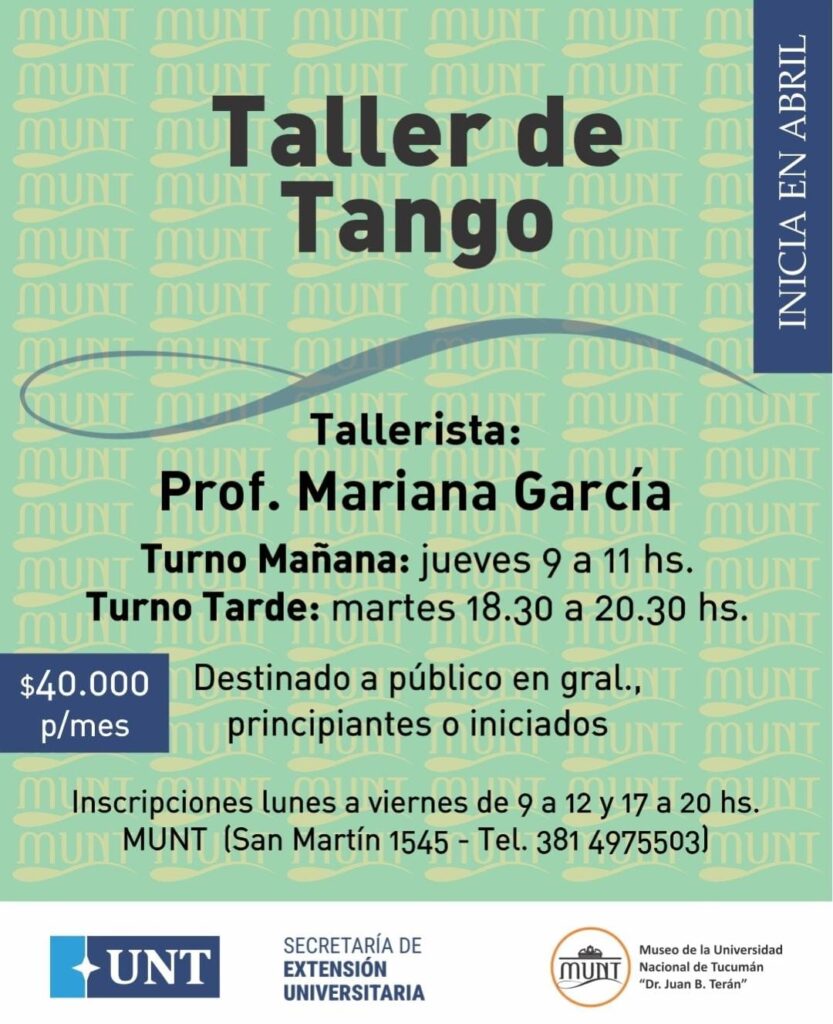 Con inicio en abril de 2026, el Taller de Tango estará a cargo de la profesora Mariana García y tendrá una duración anual. La propuesta está dirigida al público en general, tanto principiantes como personas con experiencia previa.