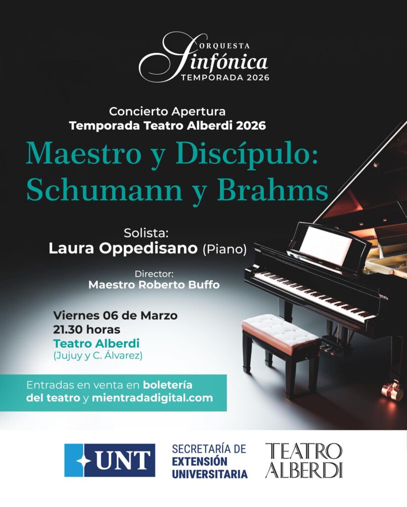 El Teatro Alberdi inaugurará su Temporada 2026 el próximo viernes 6 de marzo, a las 21:30 en el Teatro Alberdi, con un concierto a cargo de la Orquesta Sinfónica de la Universidad Nacional de Tucumán. La formación presentará el concierto “Maestro y Discípulo: Schumann y Brahms”, un programa que celebra la conexión artística entre dos de los grandes compositores del Romanticismo alemán.