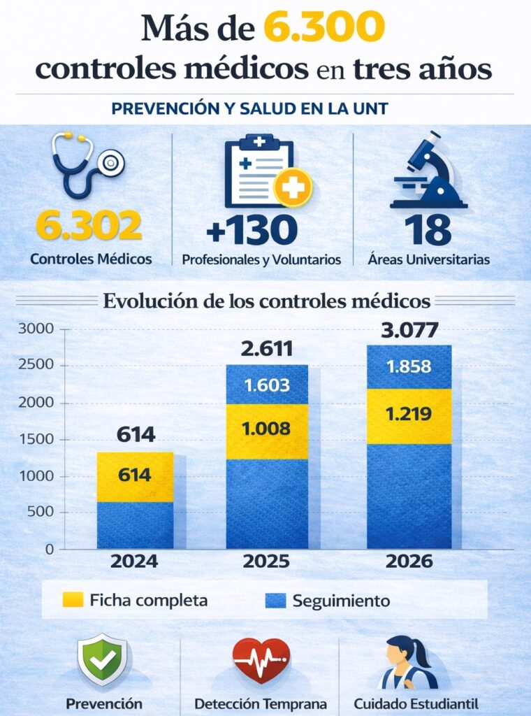 Entre 2024 y 2026, la iniciativa permitió realizar 6.302 controles médicos, combinando fichas médicas completas y controles de seguimiento. Los números muestran la magnitud de una política sanitaria universitaria que articula profesionales de la salud, docentes, personal técnico y estudiantes en formación.