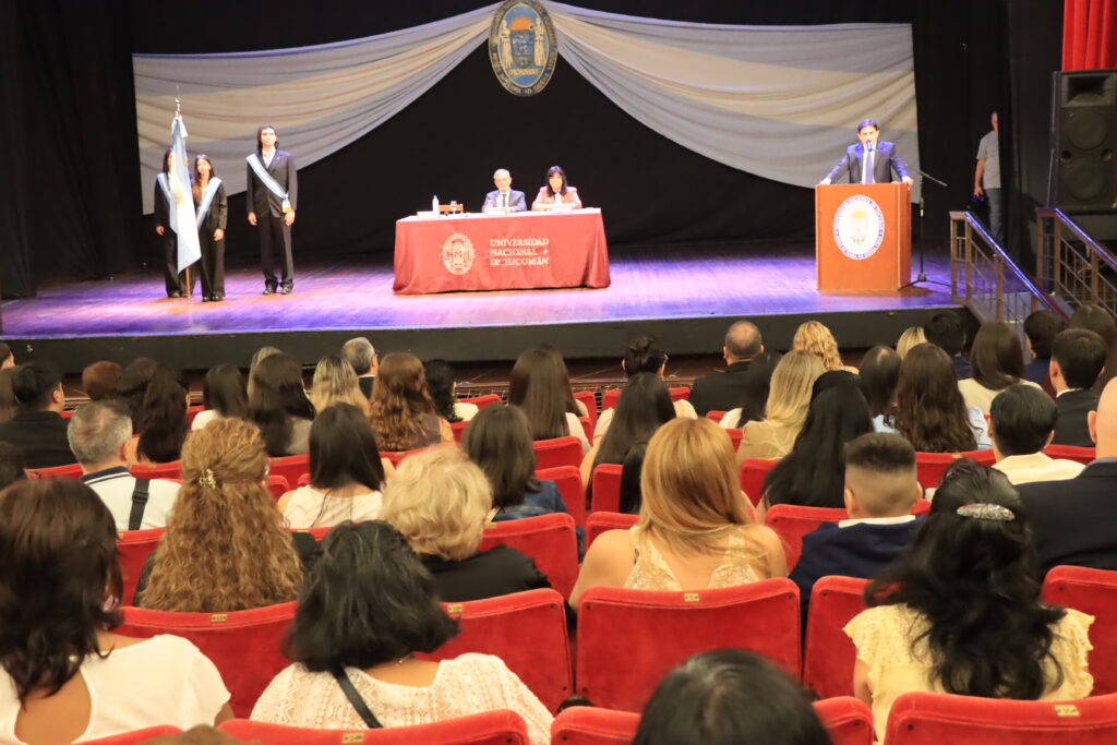 En las instalaciones del Teatro Alberdi, con la presencia del rector de la Universidad Nacional de Tucumán, Ing. Sergio Pagani, y del decano de la Facultad de Medicina, Prof. Dr. Mateo Martínez, se llevó a cabo la primera ceremonia de colación de grado del año 2026 para las carreras de Medicina y Kinesiología. La mesa de honor estuvo integrada además por la vicedecana, Liliana Mónica Tefaha, junto a autoridades académicas. El acto comenzó con el ingreso de la bandera de ceremonia, portada por la abanderada Candela Fernández Willing, acompañada por la primera escolta Luciana Agustina Lepen y los segundos escoltas Cecilia Perelmut, Ximena Ayelén Pinto y Daniel Jesús Lobo Cartagena. Luego se entonaron las estrofas del Himno Nacional Argentino y se desarrollaron las instancias protocolares, incluyendo el discurso de las autoridades, el retiro de la insignia patria, la toma de juramento y la entrega de diplomas.
