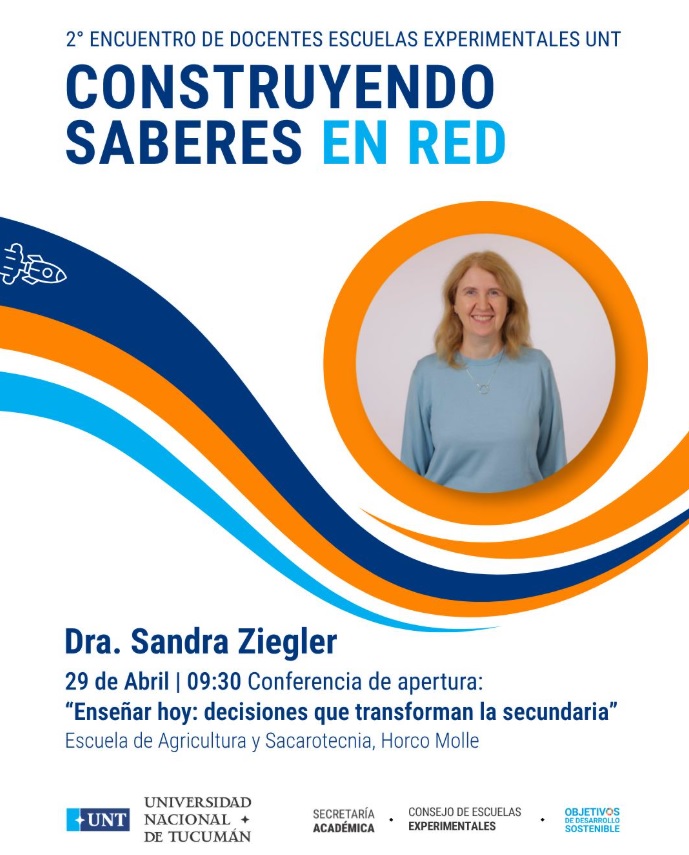 En el marco del 2° Encuentro de Docentes de Escuelas Experimentales UNT: Construyendo saberes en red, la Universidad Nacional de Tucumán realizará el próximo 29 de abril a las 9.30, en la Escuela de Agricultura y Sacarotecnia de la UNT, en Horco Molle, la conferencia de apertura “Enseñar hoy: decisiones que transforman la secundaria”, a cargo de la reconocida especialista Dra. Sandra Ziegler.